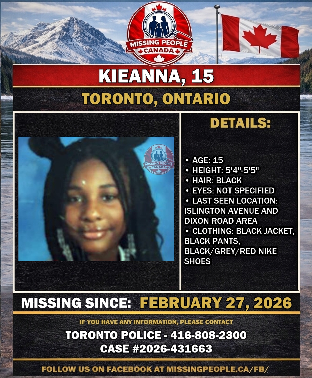 The Toronto Police Service is requesting the public’s assistance locating a missing youth, Kieanna, 15. Kieanna was last seen on Friday, February 27, 2026 at approximately 10 a.m., in the Islington Avenue and Dixon Road area. Police are concerned for safety.