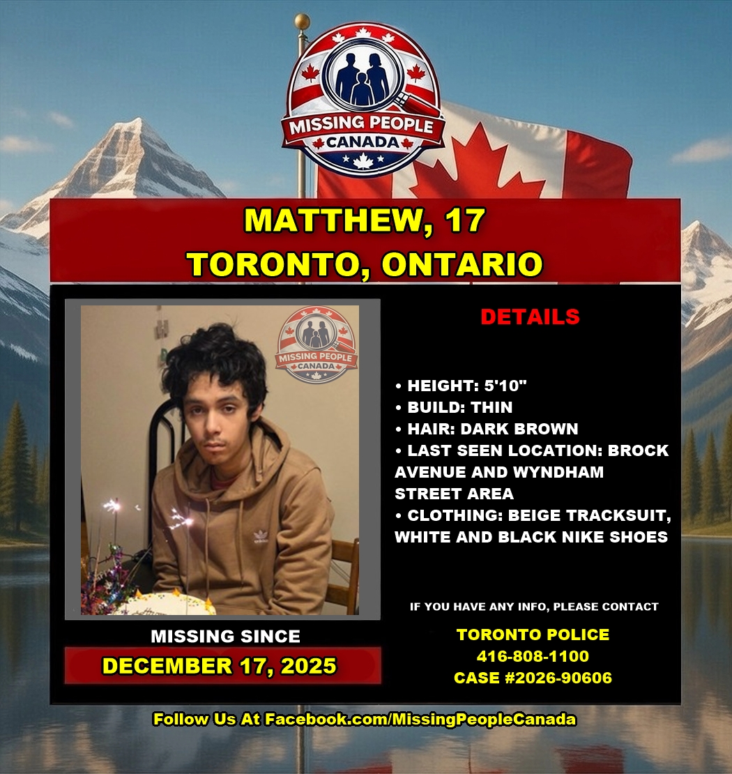 The Toronto Police Service is requesting the public’s assistance locating a missing youth, Matthew, 17. Matthew was last seen on Wednesday, December 17, 2025, at 1 p.m., in the Brock Avenue and Wyndham Street area. Police are concerned for their safety.
