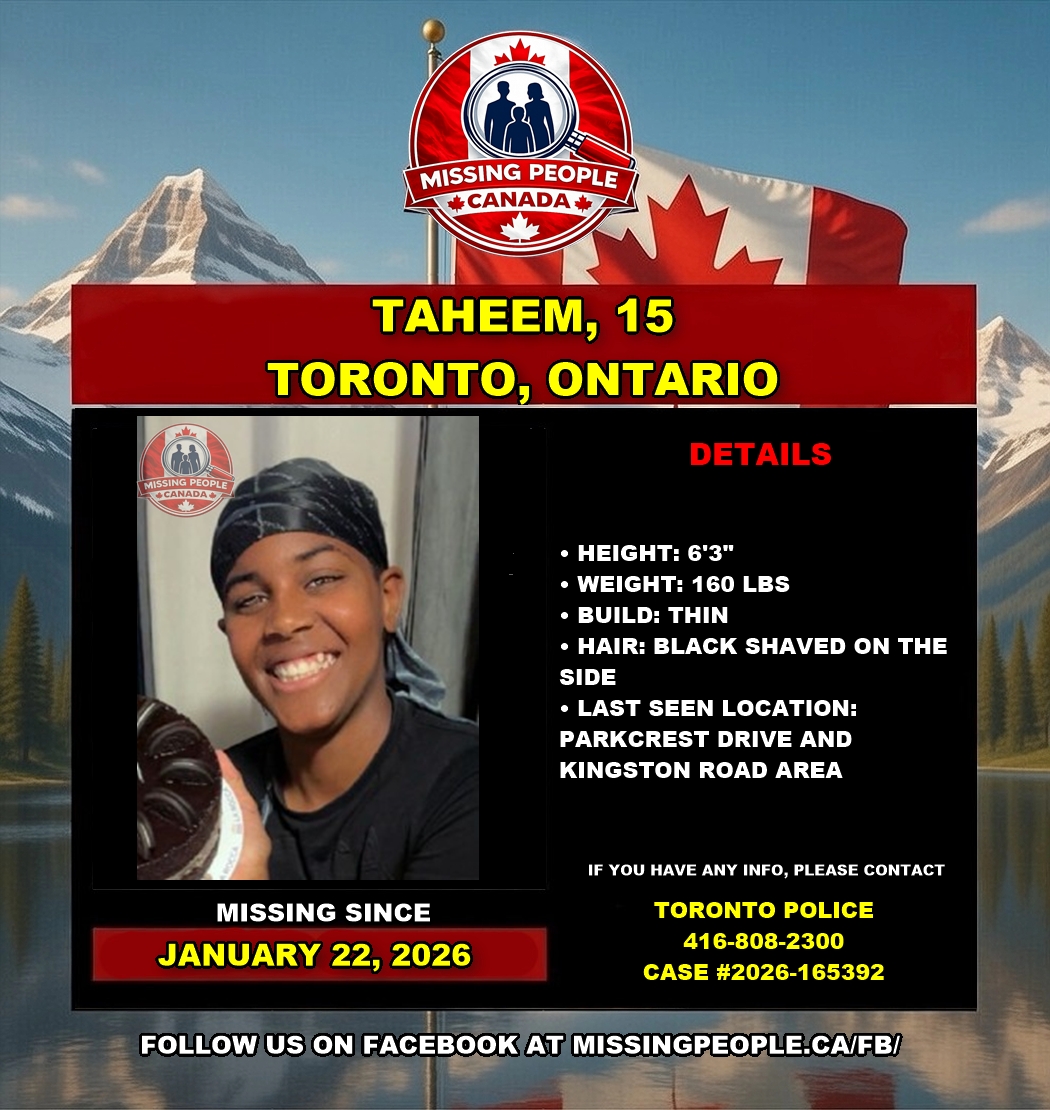The Toronto Police Service is requesting the public’s assistance locating a missing youth, Taheem, 15. Taheem was last seen on Thursday, January 22, 2026, at 7:30 a.m., in the Parkcrest Drive and Kingston Road area. Police are concerned for their safety.