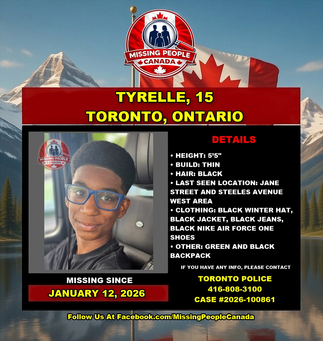 The Toronto Police Service is requesting the public’s assistance locating a missing youth, Tyrelle, 15. Tyrelle was last seen on Monday, January 12, 2026, in the Jane Street and Steeles Avenue West area. Police are concerned for their safety.