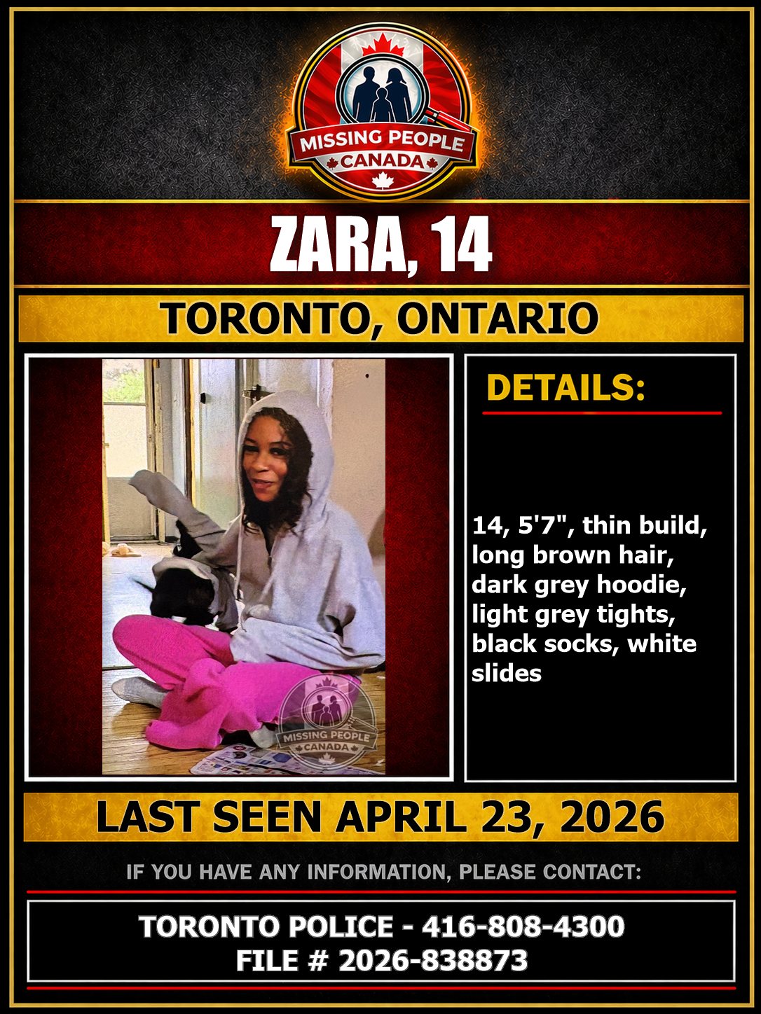 🚨 MISSING YOUTH IN TORONTO, ONTARIO – ZARA, 14 – LAST SEEN APRIL 23, 2026