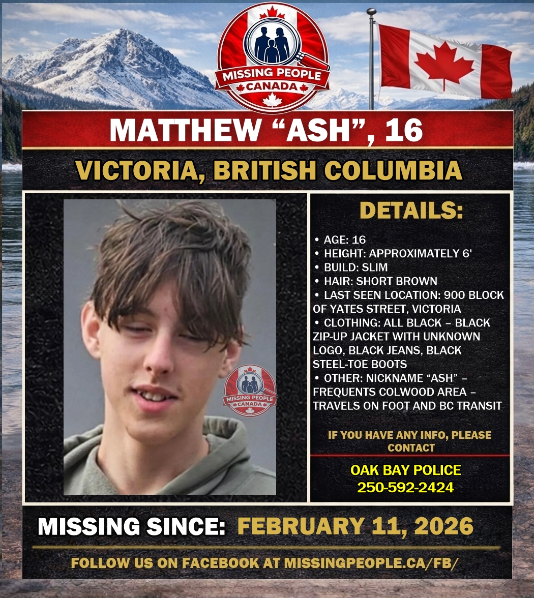 The Oak Bay Police Department is seeking the public’s assistance in locating a missing 16-year-old youth, Matthew “Ash”. Matthew was reported missing on February 12, 2026, and was last seen the day before, on February 11, 2026, in the 900 block of Yates Street in Victoria. Police are concerned for his well-being.