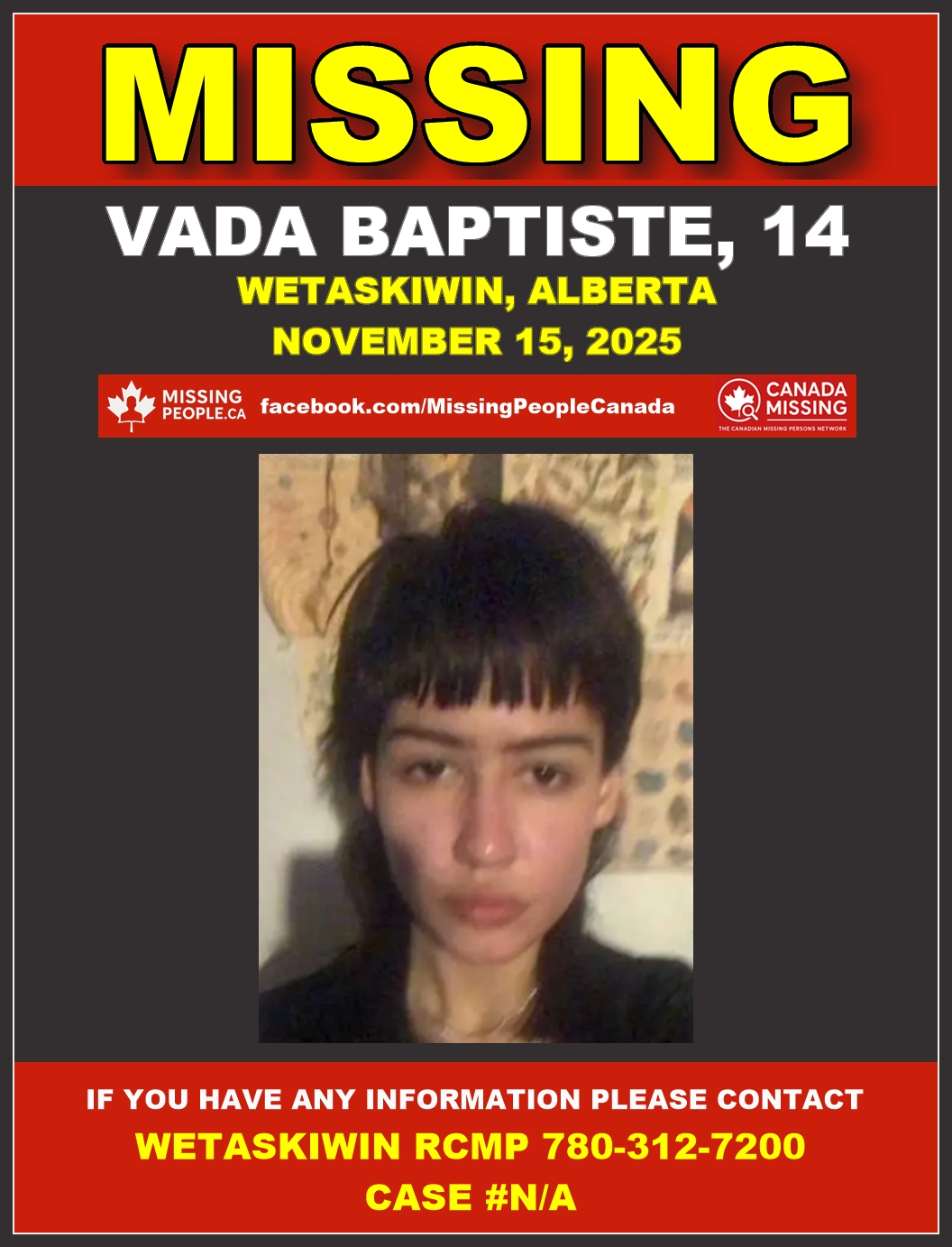 - RCMP Alberta X (Twitter) – Missing: Vada Baptiste