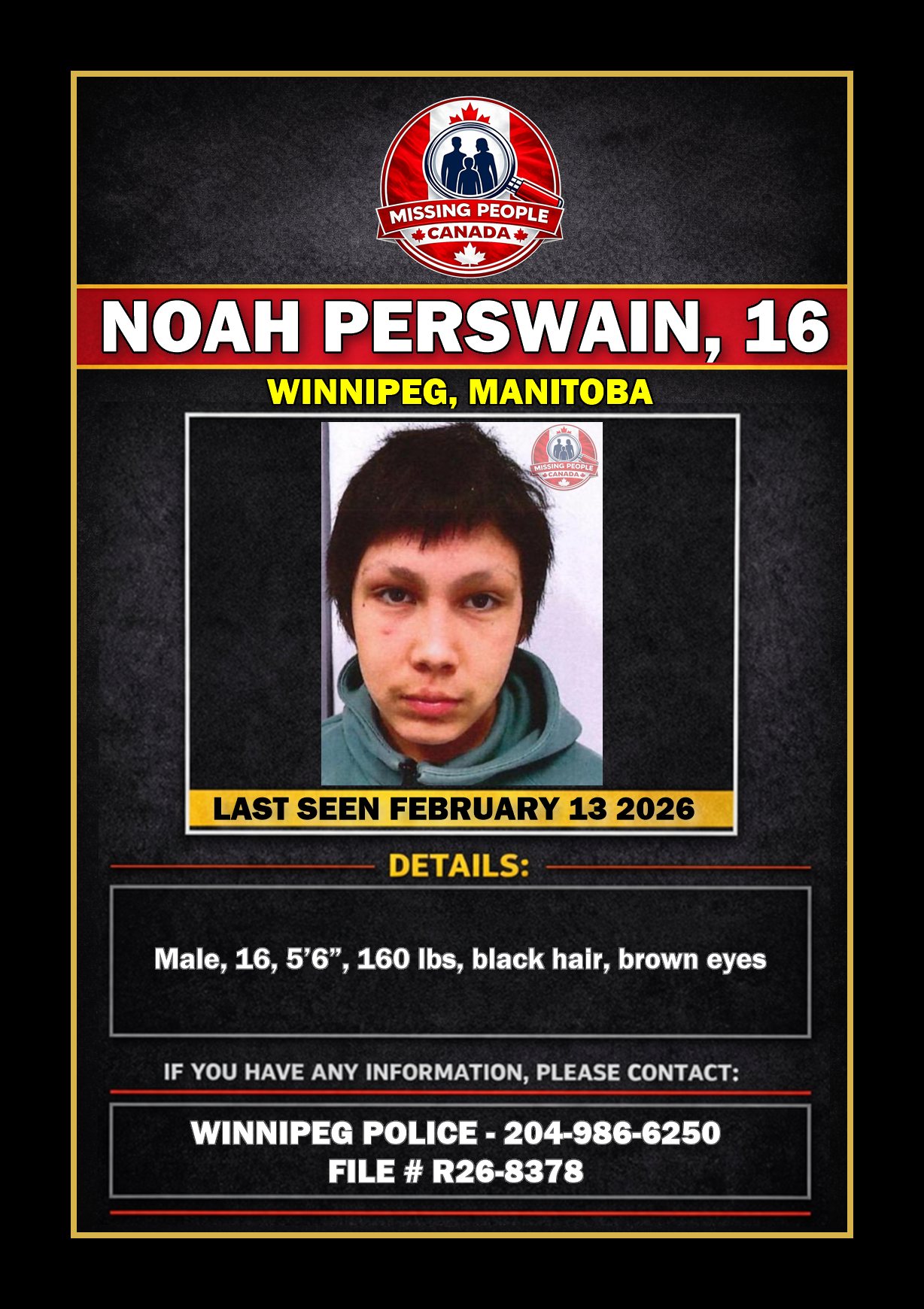 MISSING YOUTH IN WINNIPEG, MANITOBA – NOAH PERSWAIN, 16 – LAST SEEN FEBRUARY 13 2026