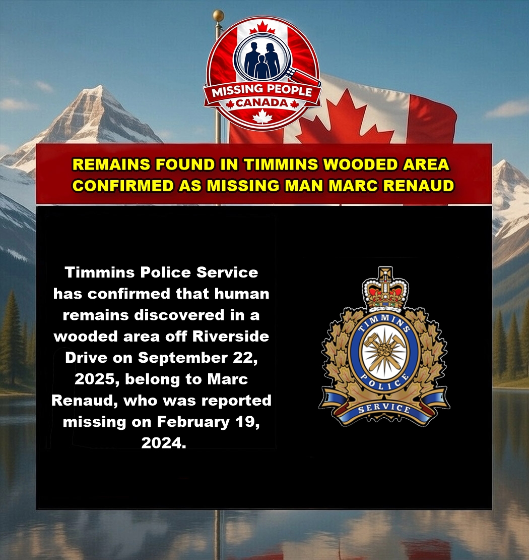 The Timmins Police Service has confirmed that human remains discovered in a wooded area off Riverside Drive on September 22, 2025, at approximately 1:21 p.m., belong to Marc Renaud, who was reported missing on February 19, 2024. The next of kin has been notified.