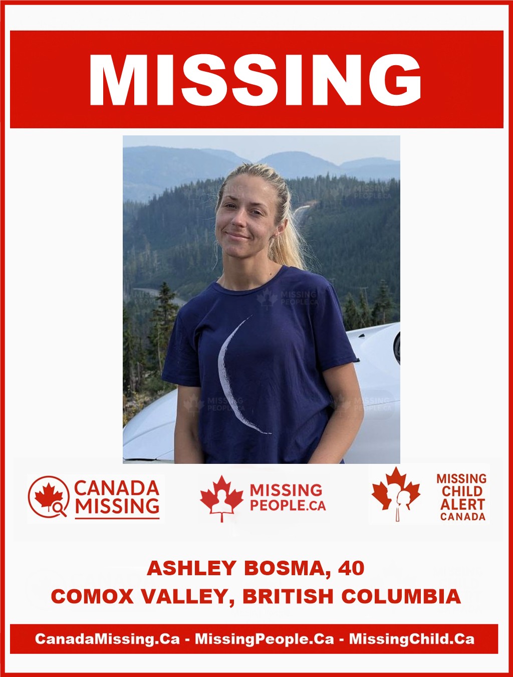 Anyone with information about Ashley Bosma or her possible whereabouts is asked to contact the Comox Valley RCMP at 250-338-1321.