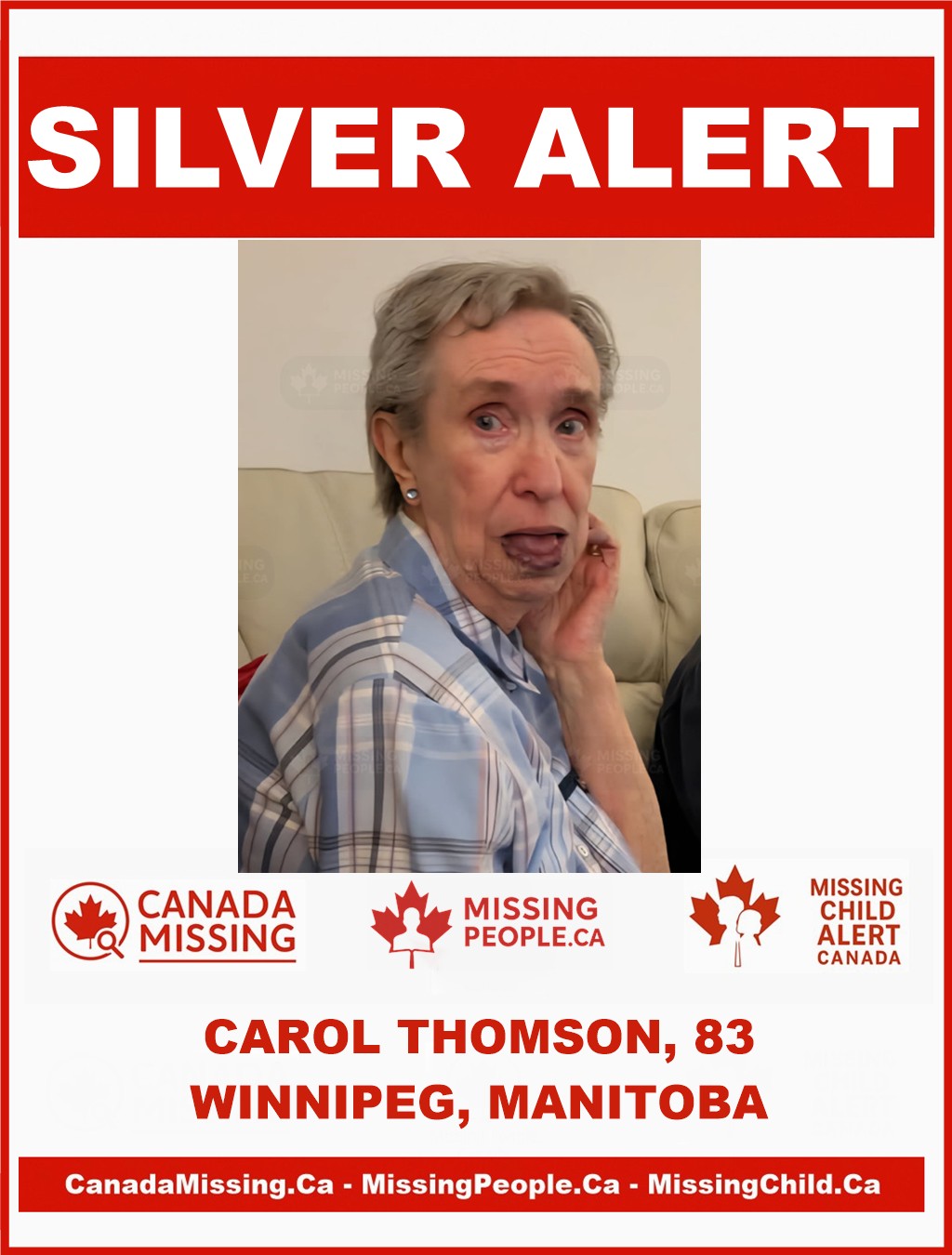 The Winnipeg Police Service has activated a Silver Alert as officers request the publicβs assistance in locating Carol Thomson, an 83-year-old woman last seen on Sunday, October 19, 2025, around 11:30 a.m. in the Westwood area of Winnipeg.