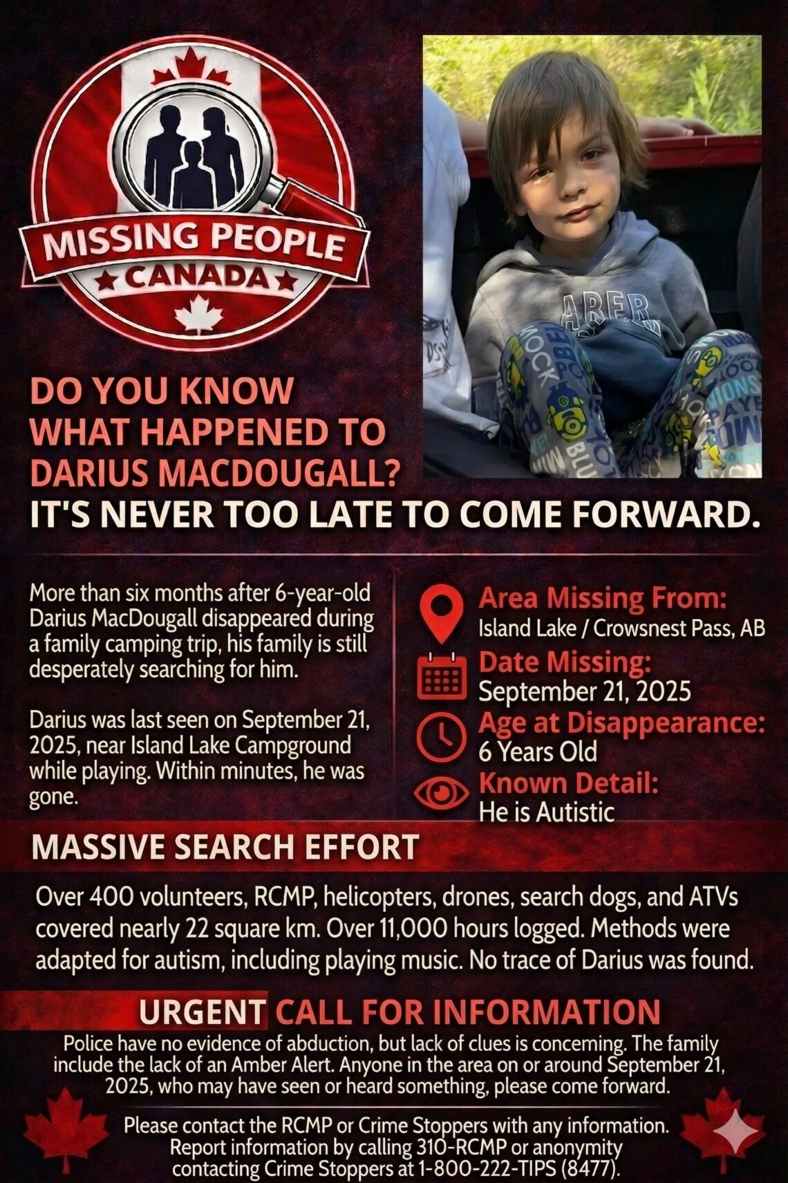 🚨 MISSING BOY IN CROWSNEST PASS, ALBERTA – DARIUS MACDOUGALL, 6 – LAST SEEN SEPTEMBER 21, 2025