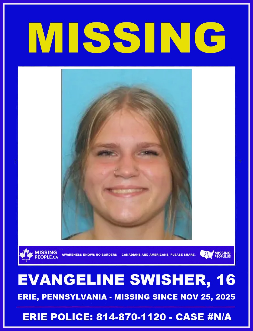 Please share this post widely in the Erie area – Evangeline needs to be found quickly. While this case is from the United States, we’re sharing it because missing people can sometimes travel or be taken across borders. With so many Canadians visiting or living near the U.S. border, public awareness here can still make a difference.