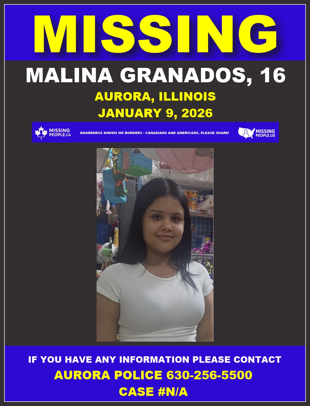 The Aurora Police Department is asking for assistance in locating a missing 16-year-old girl, Malina Granados. Malina has a history of voluntarily leaving home without notice and was last seen on January 9, 2026, around 4:00 a.m. in the 500 block of Parker Ave. Police are concerned for her wellbeing.