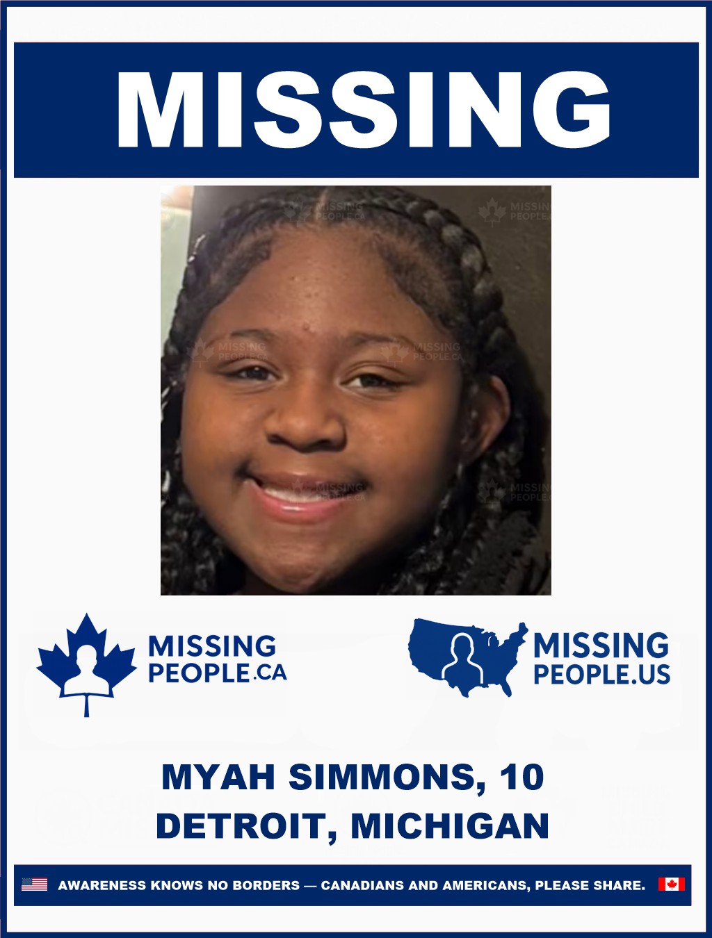The Detroit Police Department is seeking the public’s help in locating 10-year-old Myah Simmons, who left her residence in the 15700 block of Indiana Street without permission and did not return home on Thursday, October 16, 2025.