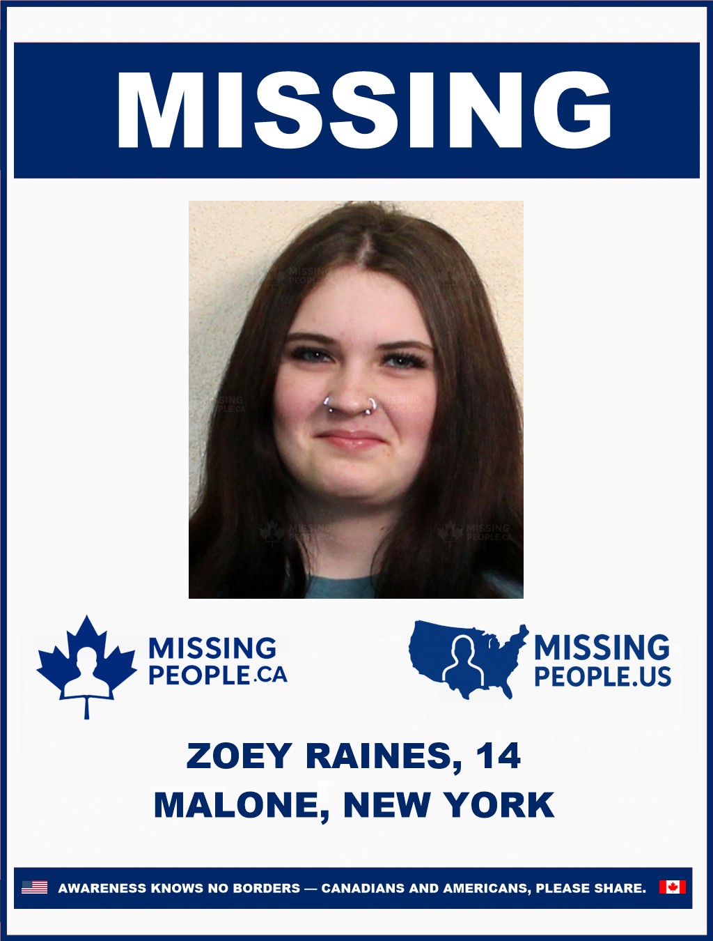 The Malone Village Police Department is asking for the public’s assistance in locating 14-year-old Zoey E. Raines, who has been missing since October 12, 2025, from Malone, New York.