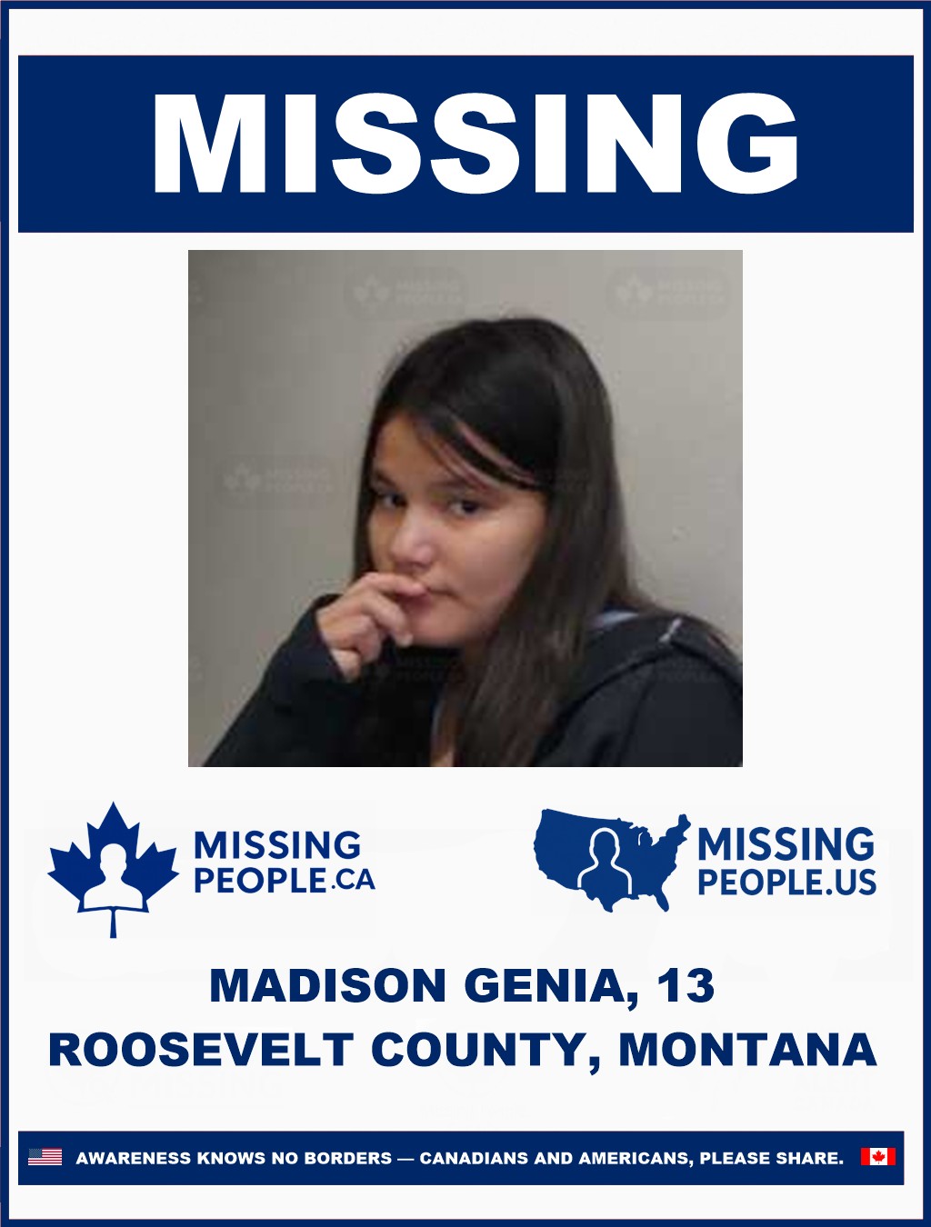 The Roosevelt County Sheriff’s Office and the Montana Missing Persons Clearinghouse are asking for the public’s help in locating 13-year-old Madison Isabella Genia. She has been missing since September 29, 2025, and was last seen that same day in Roosevelt County, Montana.