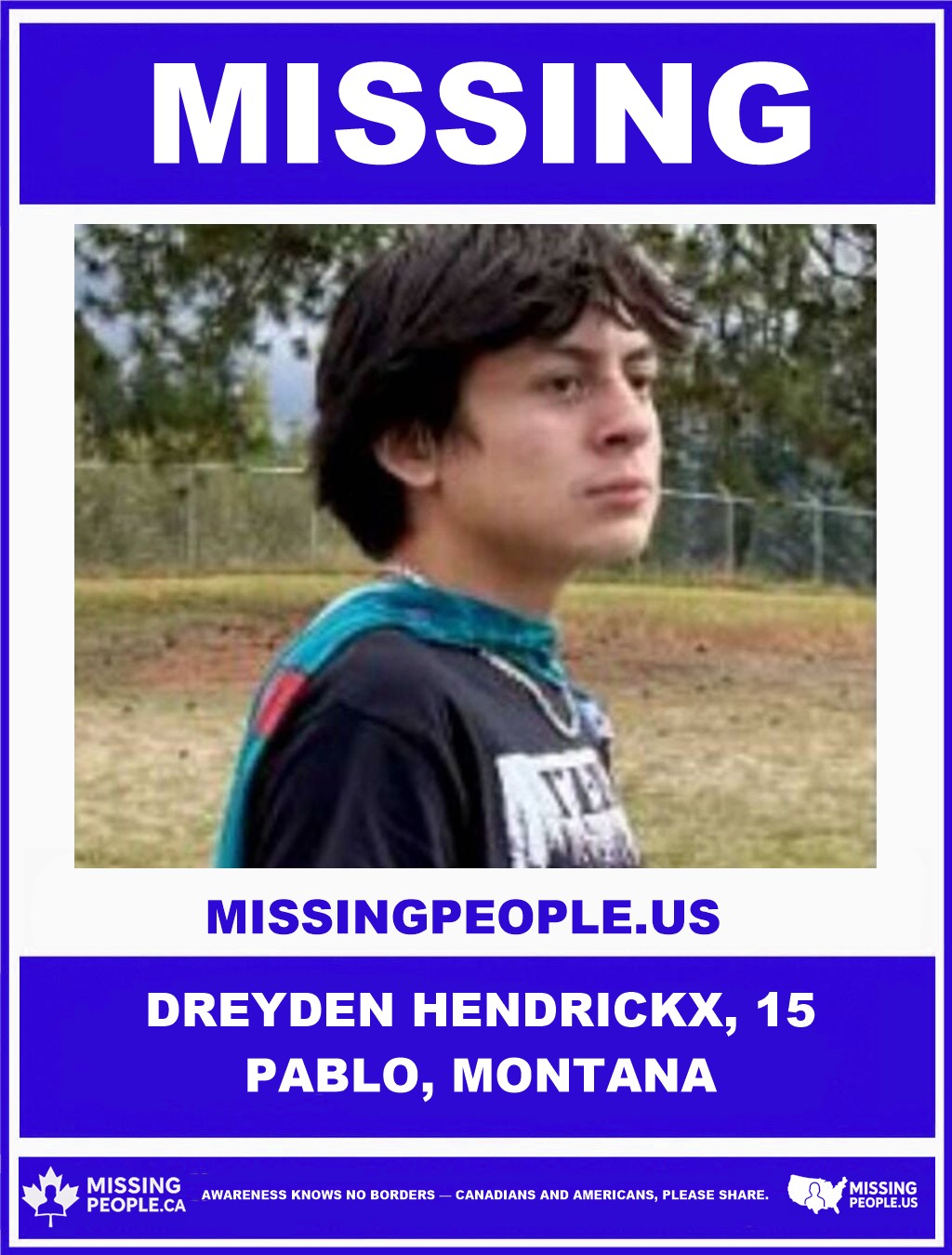 Dreyden was last seen on November 8, 2025, around 8:20 p.m., leaving a powwow on foot in Pablo, Montana. He has not been seen or heard from since.