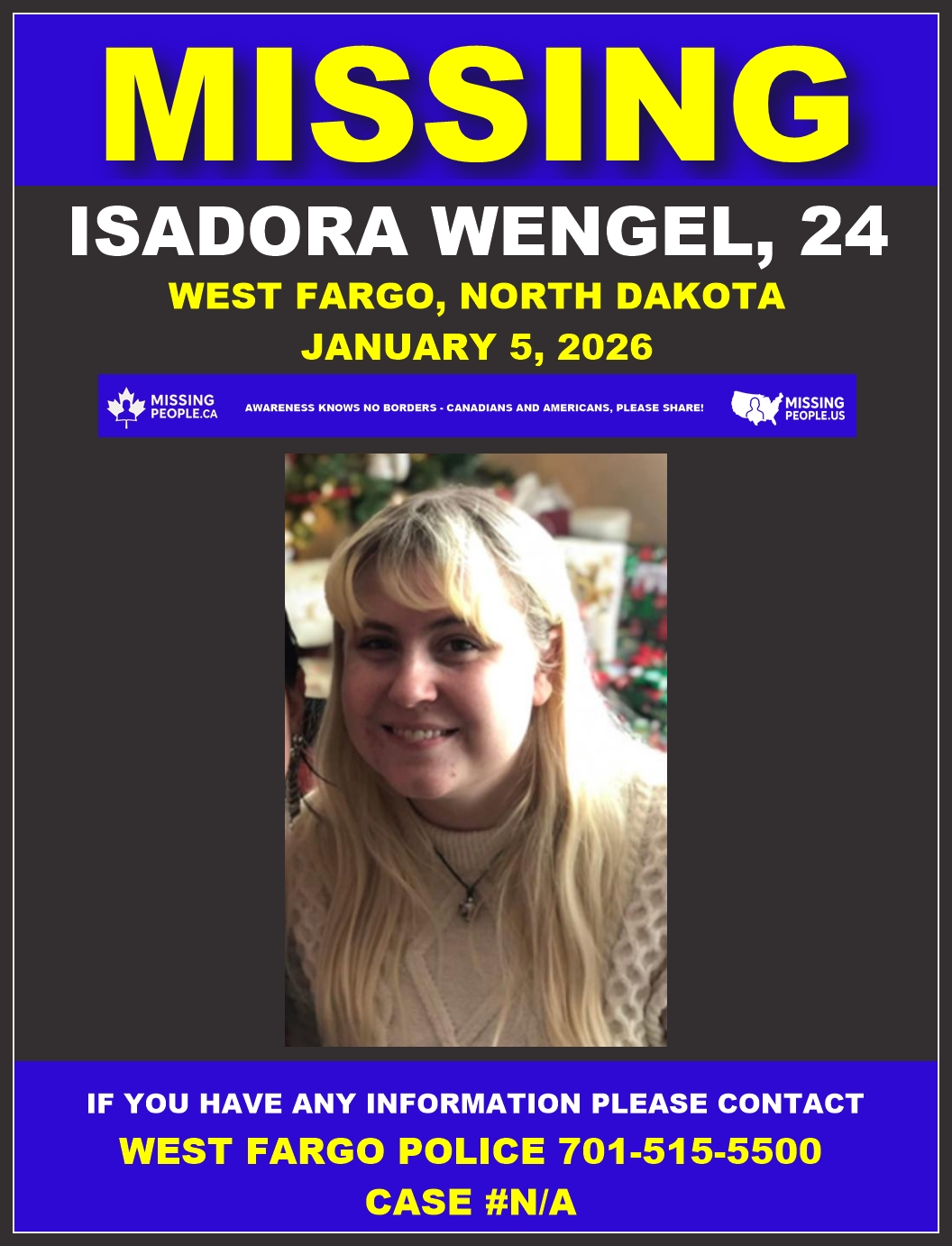 The West Fargo Police Department is asking for the public’s help in locating a missing 24-year-old woman, Isadora Wengel. Isadora was last seen in the early morning hours of January 5, 2026, near the 900 block of 3 ½ Avenue E. in West Fargo. Police are concerned for her wellbeing.